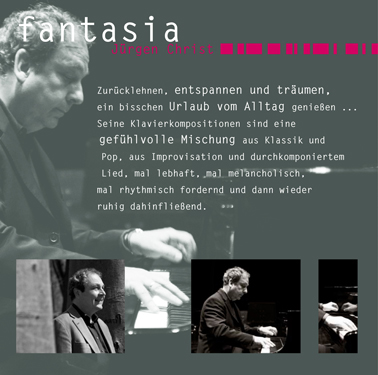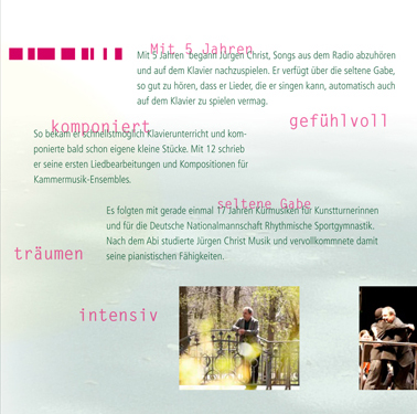 CD-Covergestaltung (mit Alternativentwürfen) für die gefühlvollen Klavierstücke von Jürgen Christ. Die Innenseiten zeigen den Künstler und sein kreatives Schaffen.